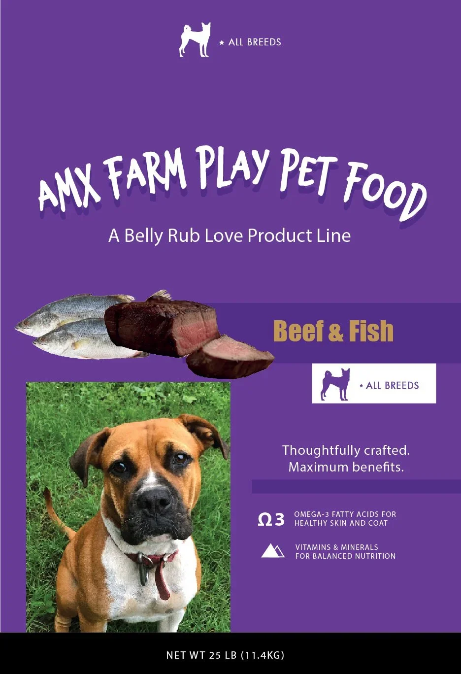 Our Beef & Fish formula is made with real ingredients, Omega-3s for skin and coat, and essential vitamins and minerals for all-breed nutrition.
